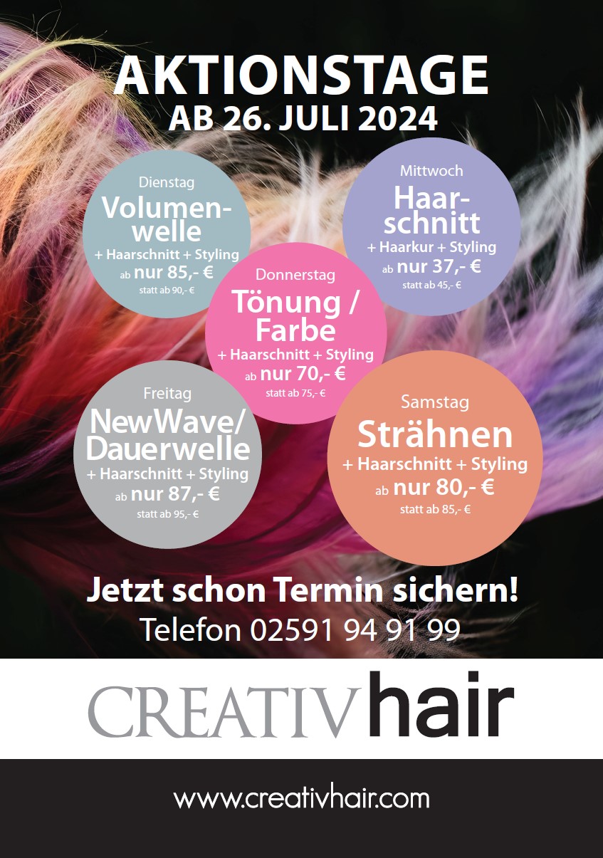 Seit Jahren gehört das Team von creativHair zu den Top-Friseuren im Münsterland und ist dem Trend immer eine Haarlänge voraus. Dafür werden regelmäßig Schulungen und Veranstaltungen besucht, um die neuesten Trends mit nach Lüdinghausen zu bringen.